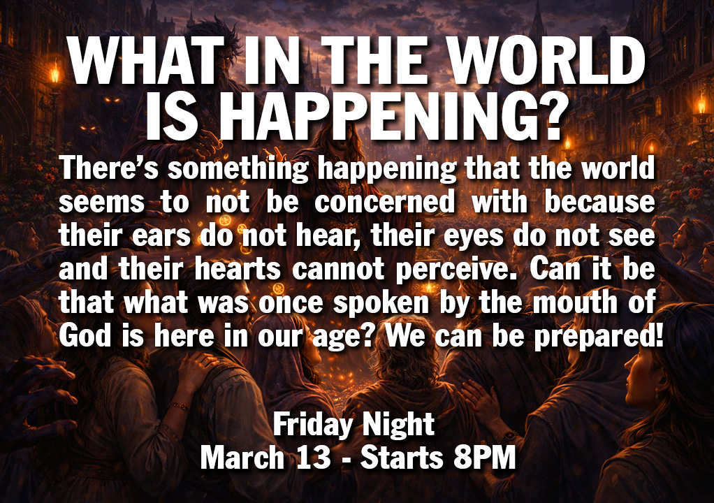 THE LIVE PRAYER CONFERENCE CALL Our chance to come together in the Spirit - There will be Sharing, the Word - some prophecy news updates - Praying together - Then live Intercession & Praise - & the Aaronic Blessing live - Wednesday, 11:15AM to Noon. To get in on the Live Prayer Conference Call, just call in - 978-990-5000 - and then when prompted, press the Password Code - 261225# (If it's busy, just try again - until you get through.) (*Best to get in early from 11AM onward). WEDNESDAY 5PM - The Mid-Week Streaming - Starts Weds. 5PM Goes Through Thursday 5PM - More than one message and other special features, videos, music - that our media ministry put together - It was originally for people who couldn't go to services as not in our area - and has things for Hope of the World - etc. - But now we pray it will be a blessing for you. For streaming go to: bethisraelworshipcenter.org/stream *For All Wednesday Events Below- enter through the office side entrance only (not the main entrance) and proceed to the third door on your left. MIDWEEK BIBLE STUDY (Note: Currently on break, resumes Wednesday March 25 at 7:30PM.) Stay tuned for the new topic. THURSDAY