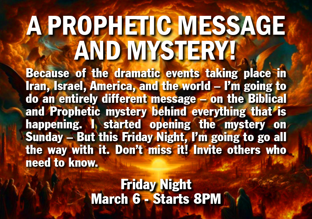 The Sunday Morning Pre-Service Prayer Meeting this Sunday 9AM (to 9:50AM) - in the Prayer Room - Even if you come after 9AM you can join in. (Special Prayer Focus: Israel, America, revival, President Trump and his Cabinet, Benjamin Netanyahu, protection for Rabbi Jonathan, Renata and family, BI, HOW, leaders, protection for the building, for the congregation, for the Holy Spirt to be poured out, healing in the body, and for God’s power to be manifested - with the book Avatar going forth – also for power and protection against all attacks – and God’s purposes in America and the world. - Scripture focus - 2 Chronicles 7:14).