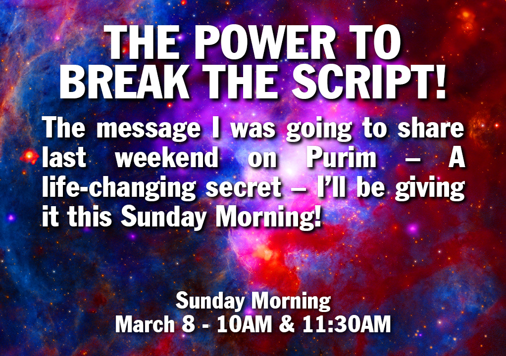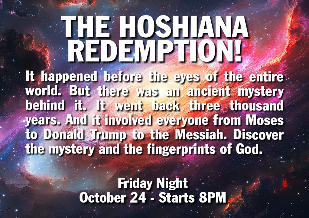 The Friday Night Pre-Service Prayer Meeting this Friday 7PM (to 7:50PM) In the Prayer Room - Even if you come after 7PM you can join in. (Special Prayer Focus: Israel, America, revival, President Trump, protection for Rabbi Jonathan, Renata and family, BI, HOW, Compassion Projects, leaders, protection for the building, for the congregation, for the Holy Spirt to be poured out and for God’s power to be manifested- with the book Avatar going forth – also for power and protection against all attacks – and God’s purposes in America and the world. - Scripture focus- 2 Chronicles 7:14).