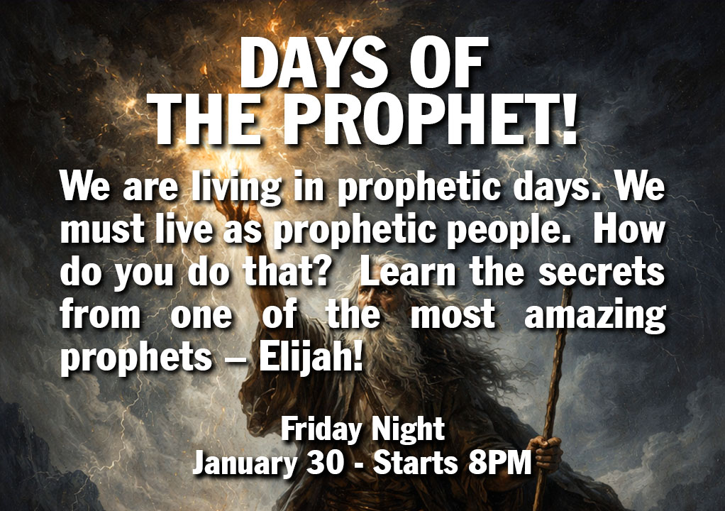 The Friday Night Pre-Service Prayer Meeting this Friday 7PM (to 7:50PM) In the Prayer Room - Even if you come after 7PM you can join in. (Special Prayer Focus: Israel, America, revival, President Trump, protection for Rabbi Jonathan, Renata and family, BI, HOW, Compassion Projects, leaders, protection for the building, for the congregation, for the Holy Spirt to be poured out and for God’s power to be manifested- with the book Avatar going forth – also for power and protection against all attacks – and God’s purposes in America and the world. - Scripture focus- 2 Chronicles 7:14).